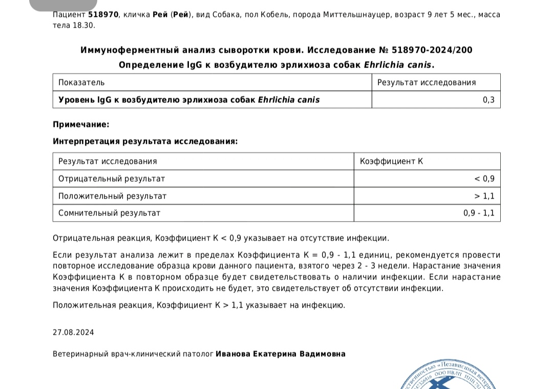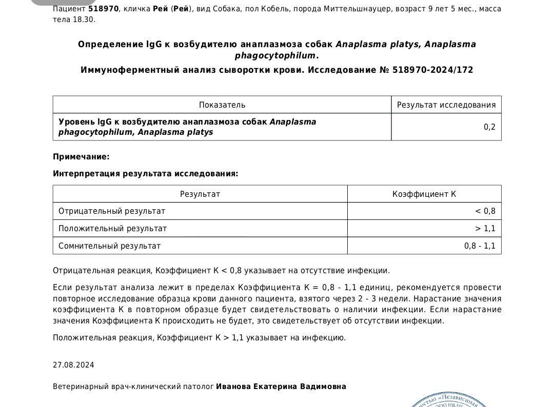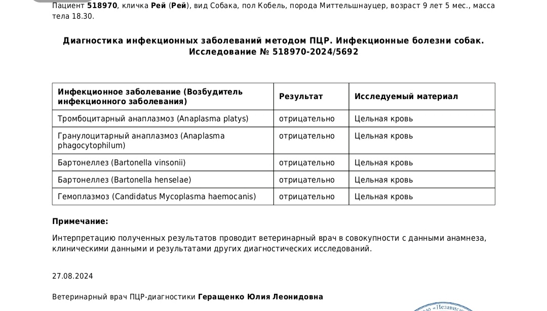 Анаплазмоз, эрлихиоз, гемоплазмоз, бартонеллез отрицательно