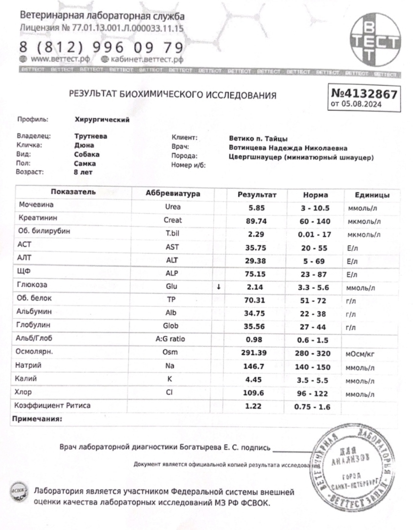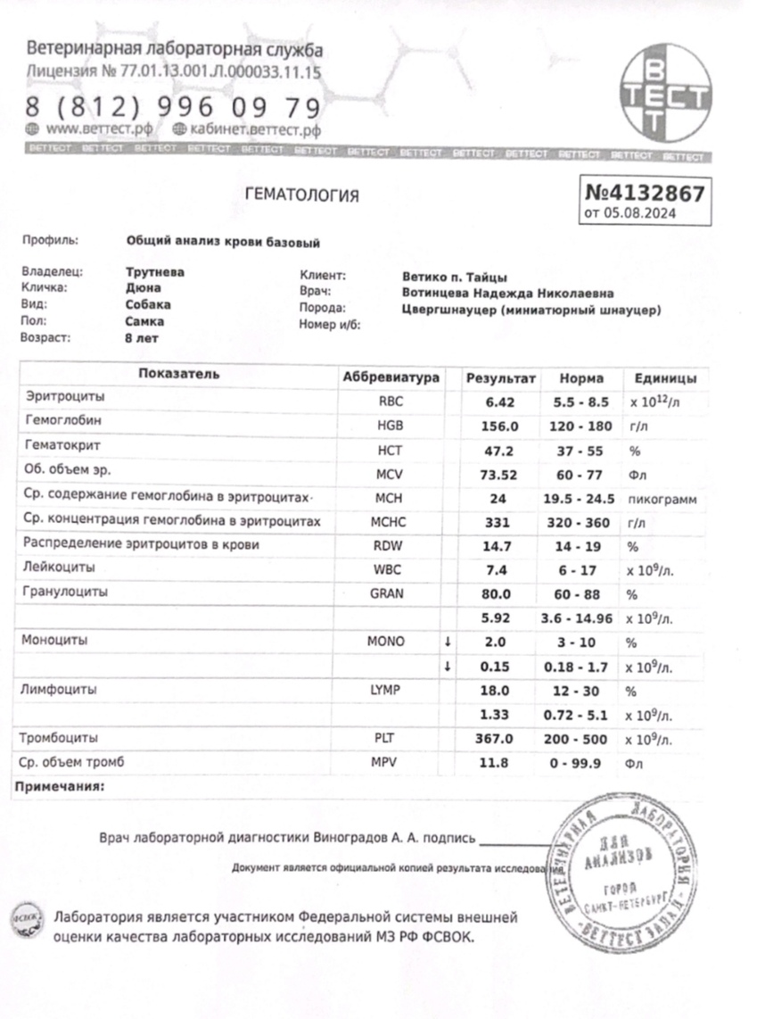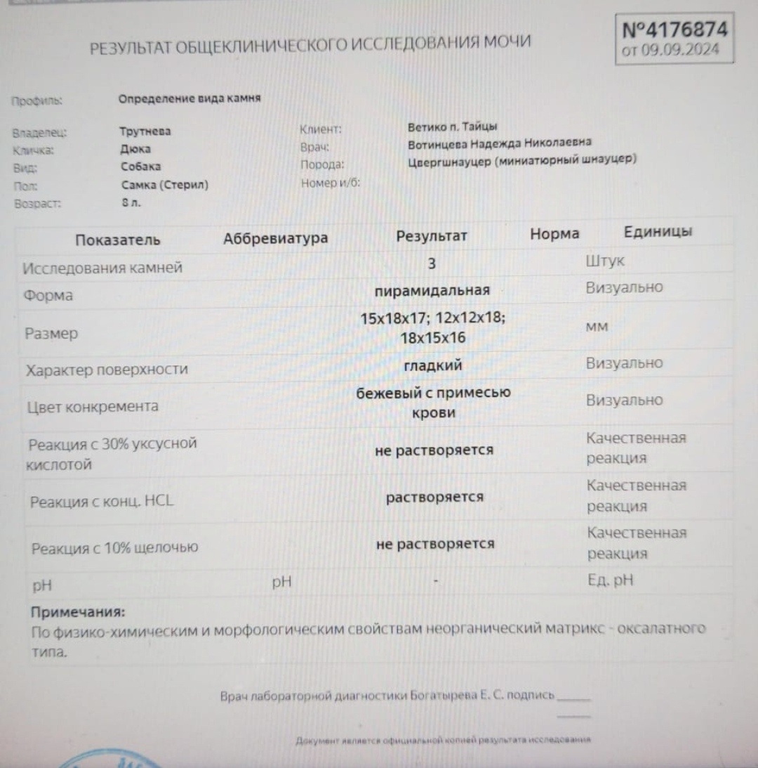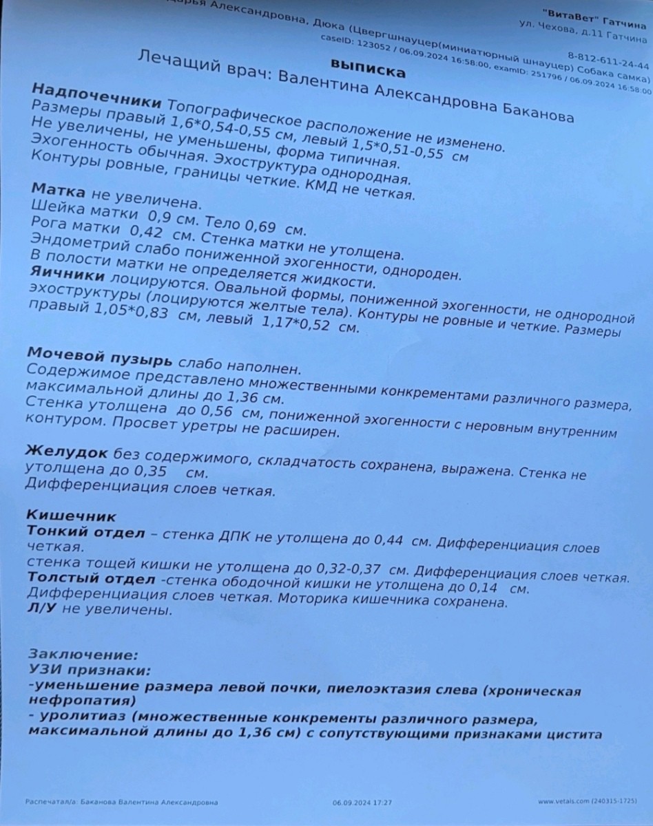 07.09.2024 удалили камни из мочевого, стерилизовали и почистили зубы.
