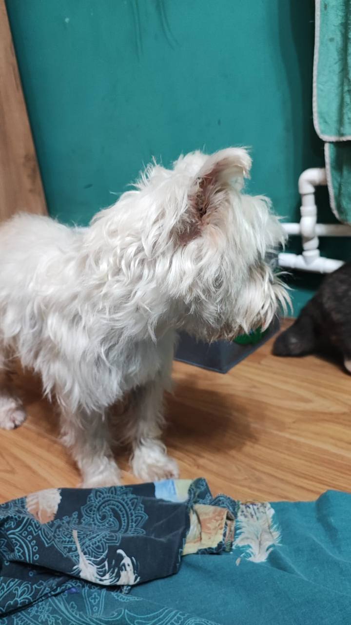 Господи, какой худющий..... И видимо от блох красное и кости наверное давали, расчесанное все около попы...