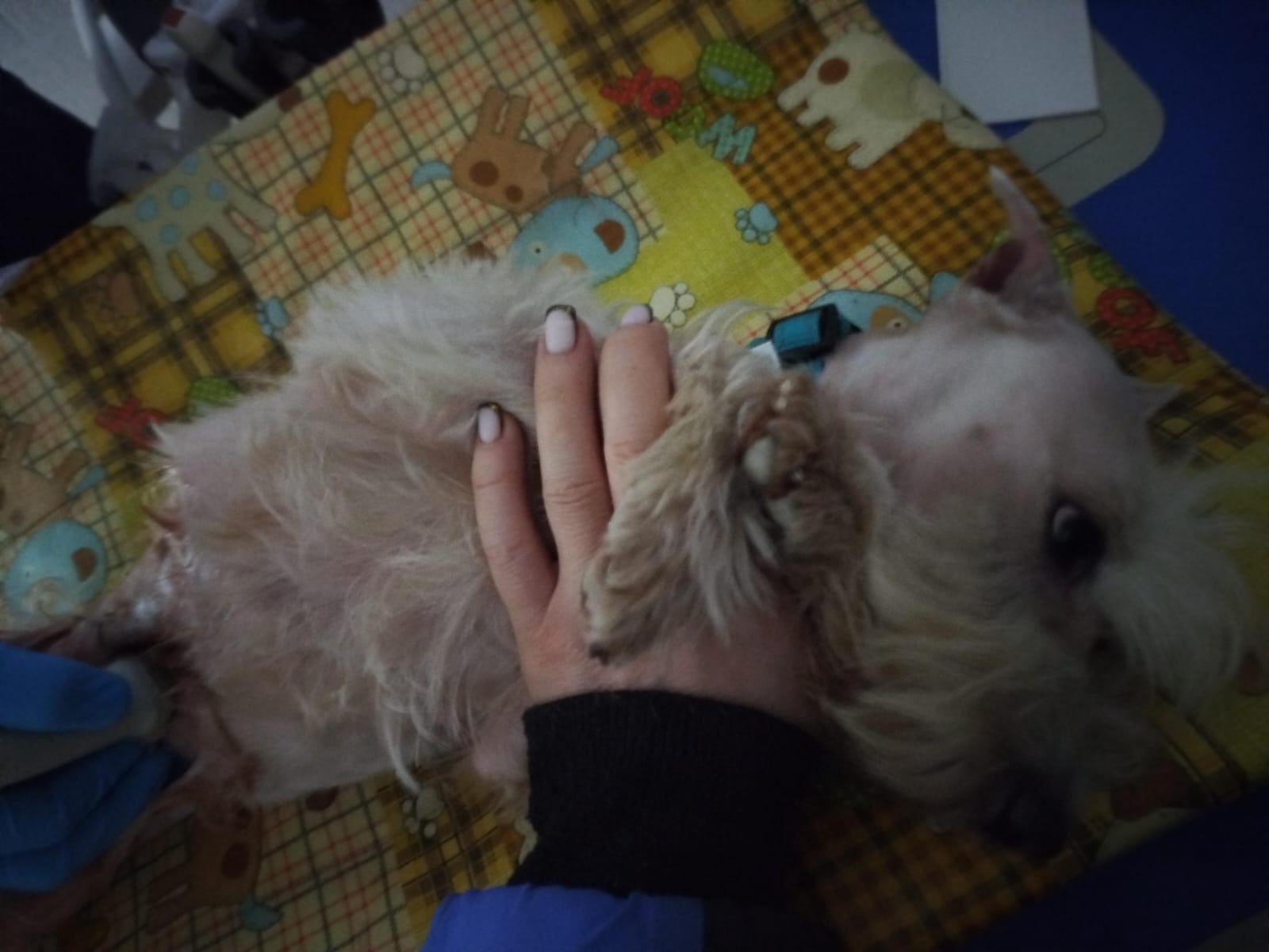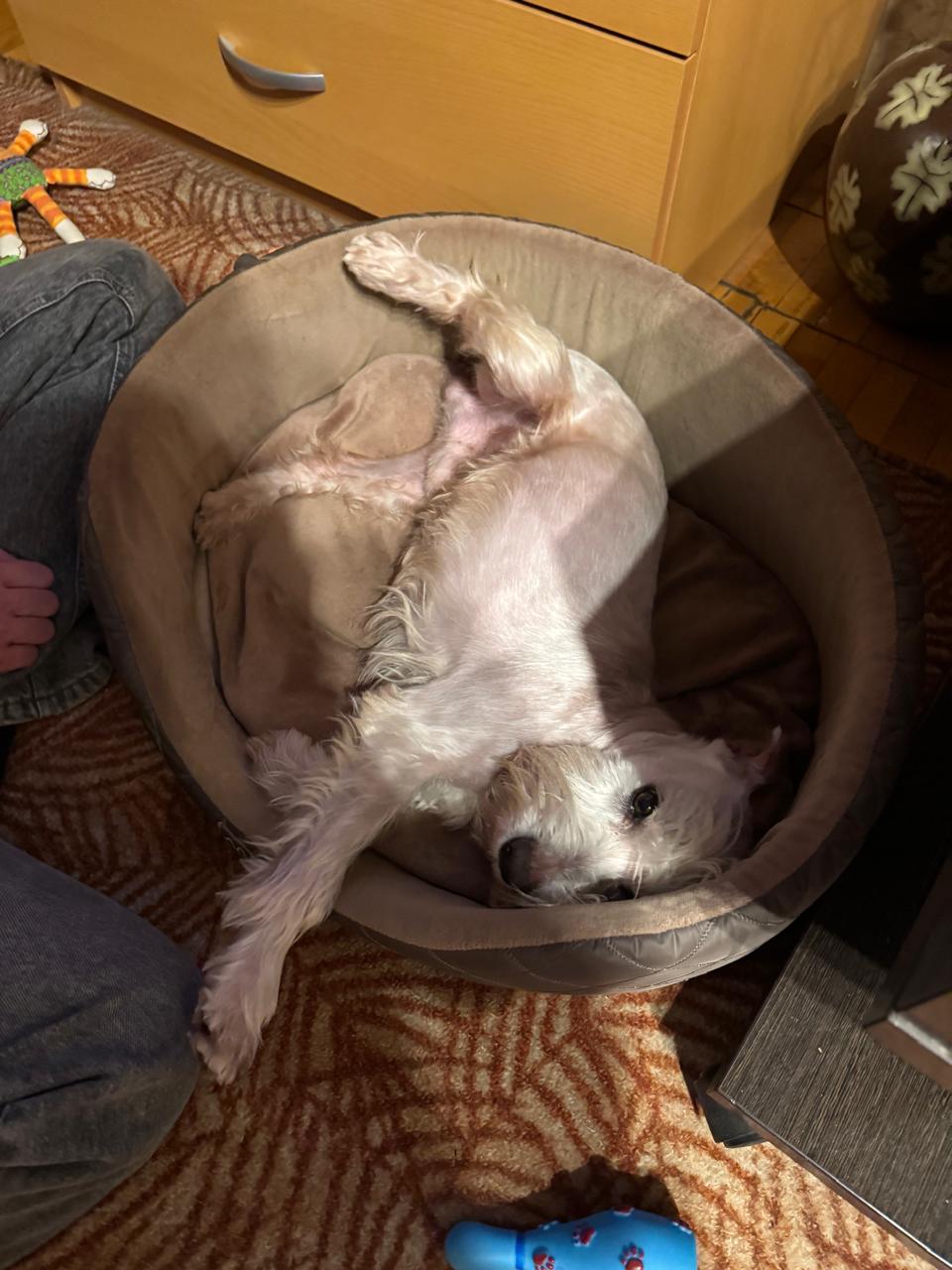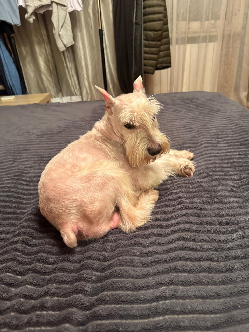 Ест хорошо, на поводке ходит хорошо, девочками очень интересуетсяОсобо не чешется, кожа розовая, но есть чёрные пятна на коже
