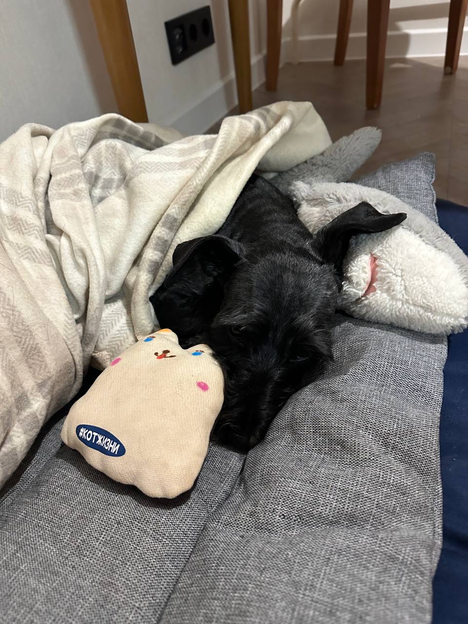 Щенулька оказалась именно такой, как ее и описывали - ласковой, немного пугливой, деликатной и понятливой. Она очень любит гладиться, в том числе и по голове, и сидеть на ручках - очень ценные для дедушки качества))) Спит на кровати без стеснения, может залезть под одеяло и прижаться, а уж как она играет и бегает - любо-дорого глядеть! Туалет строго на улице, а в остальном - все прелести жизни с молодой собакой: погрызенные зарядки от телефона, пожеванный край пододеяльника, оторванные пуговицы и сворованная еда. Но каким счастливым голосом дедушка мне обо всем этом рассказывает! Сам смеется, что собака теперь приучает его к порядку, и что в результате так чисто у него на даче давно не было)))