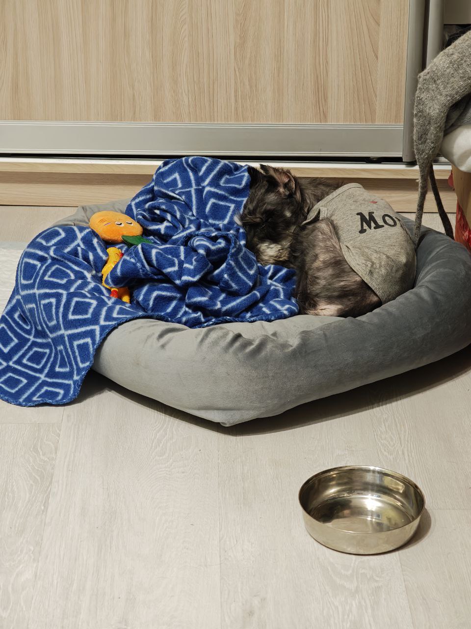 А еще ей подарили новую лежанку, она ее обожает